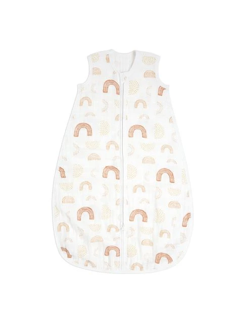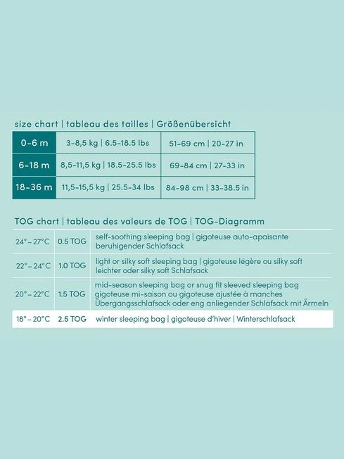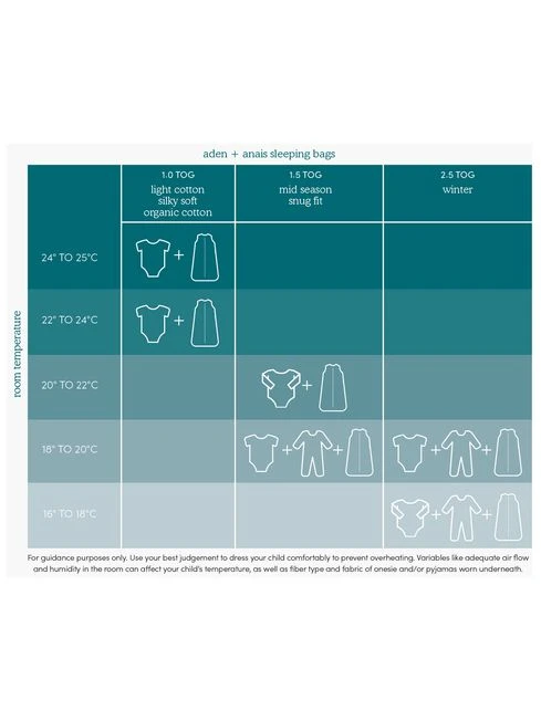 The aden + anais light sleeping bag keeps baby feeling comfy and secure when transitioning out of a swaddle and beyond. Designed to be worn over pyjamas, this 100% cotton muslin baby sleeping bag eliminates the need for loose blankets in the cot for a safer sleep. Made from a single layer of breathable muslin, the sleeping bag allows for airflow, helping to reduce the risk of overheating for a peaceful night’s sleep for baby and you. Its convenient zip opens from the bottom, making nighttime changes easy. 1.0TOG: Perfect for warmer room temperatures (22 – 24 degrees). Fabric: 100% cotton muslin. Safe: designed to be worn over pyjamas to replace loose blankets in the cot for a safer sleep. Practical: Zips open from the bottom for easy nighttime changes. Available in 3 sizes: 0 – 6 months torso length – hps to bottom edge 75cm chest width 1” below under arm edge to edge 29cm bottom width from bttm edge 3 1/2” up-edge to edge-straight 48cm 6 – 18m torso length – hps to bottom edge 90cm chest width 1” below under arm edge to edge 31.75cm bottom width from bttm edge 3 1/2” up-edge to edge-straight 55cm 18-36m torso length – hps to bottom edge 106 cm chest width 1” below under arm edge to edge 35cm bottom width from bttm edge 3 1/2” up-edge to edge-straight 63cm Machine washable. Includes: 1 100% cotton muslin sleeping bag. All of aden + anais’ fabrics are created free of azo chemical compounds and packaging is recyclable and complies with the Green Dot initiative. WARNING! Do not use if the child can climb out of the cot. WARNING! Do not use in combination with other bedding items (e.g. cot duvet). See size chart to select suitable size ‘ on sleeping bags.