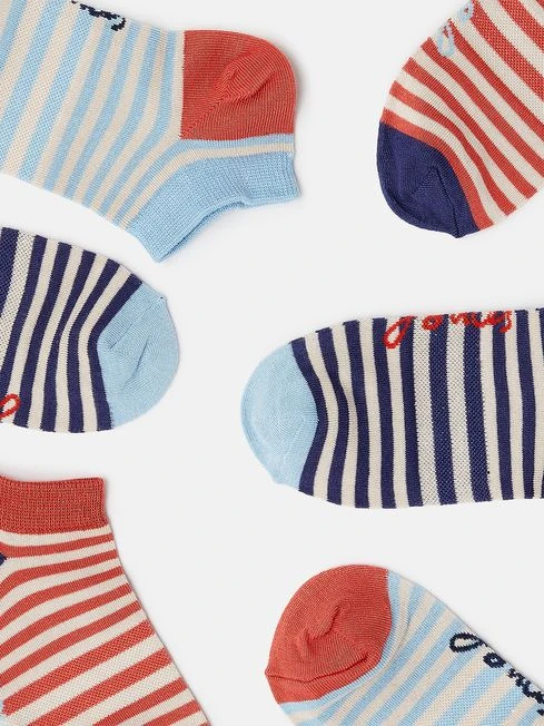 Crafted from light and airy viscose, this pack of three trainer socks make for a comfy, everyday essential. Each pair features a striped design with contrasting heel and toe. They also make a great gift for anyone who is always losing their socks. Viscose Trainer socks Pack of three Striped Contrast heel and toe Intarsia Joules script to the sole