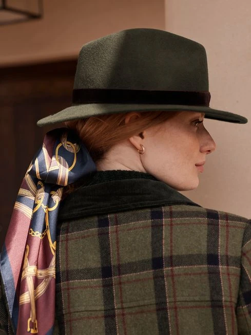 The Maude fedora is designed to add a classic finish to your countryside attire. This impeccable piece will be a lifelong favourite with its wool construction and sturdy crown that holds its shape when you’re not wearing it. It’s crafted from wool and features a plush velvet band to elevate it even more. A Joule’s metal hare decal finishes it off to perfection. 100% wool Velvet band Joules hare decal Joules metal hare decal