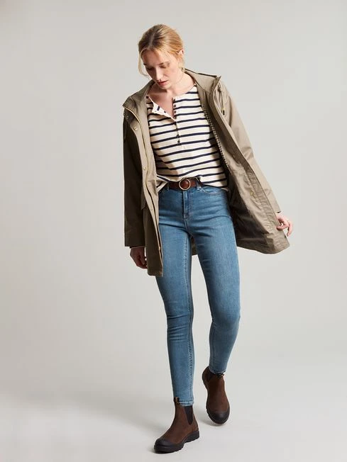 Our Padstow Raincoat is a new style and the perfect companion for wet weather walks. Its waterproof fabric and fully taped seams will keep you dry in a downpour, while its a-line shape and adjustable waist will make you feel your very best. It has an array of practical features too, including a full zip and popper fastening, two front flap pockets with poppers, and side vents with poppers for freer movement. It’s completed with toggles to the hood, a storm flap to the back and a Joules hare screen print to the hem. A-line Waterproof with fully taped seams Fixed hood with storm peak Hood toggles Adjustable waist for a flattering fit Full zip and popper fastening Two front pockets with popper fastenings Side vents with poppers for freer movement Storm flap to the back Length: 82cm (based on UK size 12)